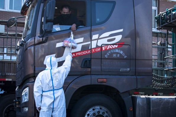 鞍山經濟開發區工作人員為貨車司機提供食品。楊科 攝