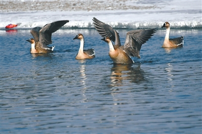 21日,一群大雁在渾河上棲息、覓食、起舞,構(gòu)成一幅動人的生態(tài)美景。近年來,沈陽渾河水質(zhì)以及生態(tài)環(huán)境良好,成為候鳥的棲息地。李浩攝