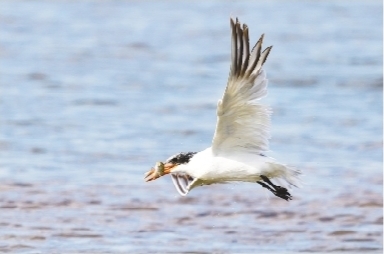 4月13日,春日碧空如洗,27只白鶴凌空展翅,排成“人”字形,從錦州市大凌河凌海段上空飛過。它們長著漂亮的紅眼睛、紅額頭、黑翅尖,通體潔白,姿態優美。自從春季遷徙季開啟以來,大凌河凌海段吸引了大量候鳥到此,除了白鶴、青頭潛鴨、天鵝等國家一二級保護動物外,野鴨種群數量明顯多于往年。這里每天有成千上萬的各種野鴨匯集,或悠游嬉戲,或歡鳴競飛。日出日落前后,經常上演鳥浪奇觀。鳥浪此起彼伏,變幻莫測,非常壯觀。圖為一只候鳥叼起一條小魚飛翔在大凌河上。