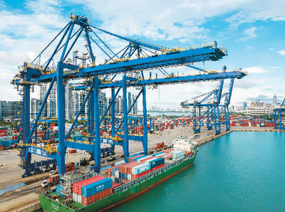 5月11日,海南省海口港集裝箱碼頭停泊著多艘大型集裝箱船,港區(qū)車來船往,裝卸繁忙。 |