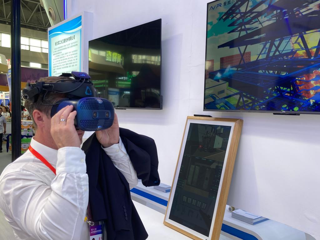 在黑龍江省專精特新企業哈爾濱愛威爾科技有限公司展位前,一名參觀者戴著VR眼鏡,在1:1還原的工廠場景中沉浸式參觀廠房車間。