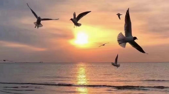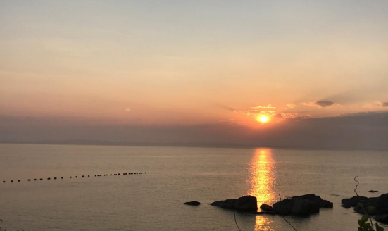 山無海不雄,海無山不秀。覺華島上“霧鎖山頭山鎖霧”的連綿景象襯托島內風光旖旎。島邊金沙灘,雪浪堆岸、海風習習,遠處鷗擊海空、船影憧憧,“天連水尾水連天”,一碧萬頃綿延如畫,夕陽西下更猶“落霞與孤鶩齊飛,秋水共長天一色”。