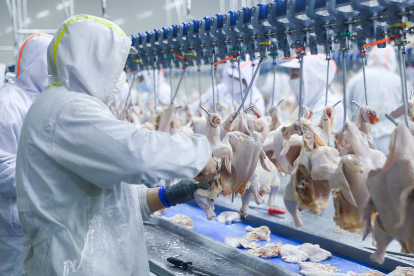 走進禾豐食品股份有限公司的白羽肉雞生產加工車間,一只只新鮮的整雞懸掛在傳輸鏈上緩慢滑動,隨著分割、切塊、裝袋……雞腿、雞架等產品不斷下線,在稱重式分級機和全自動控溫控濕系統等自動化設備的助力下,生產加工效率大大提高。